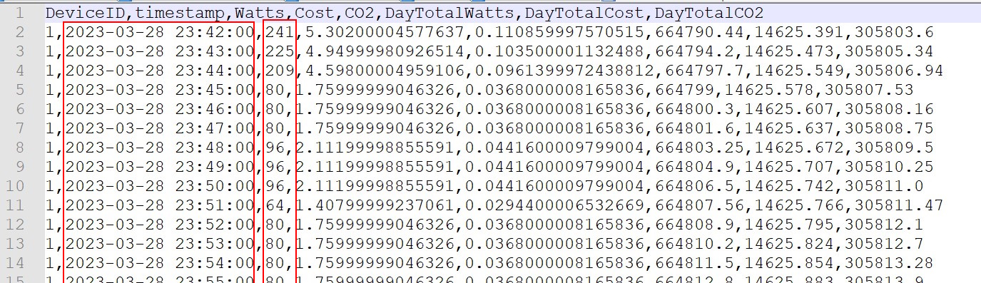 Cabecera: DeviceID,timestamp,Watts,Cost,CO2,DayTotalWatts,DayTotalCost,DayTotalCO2